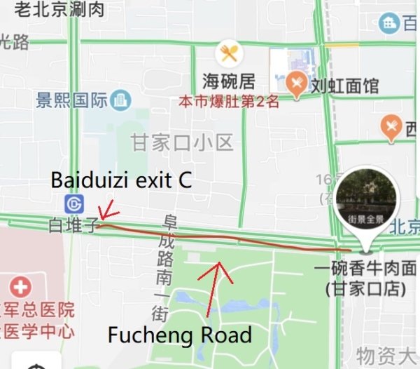 From Baiduizi station (Line 9), take exit C and walk east about 900 meters. The resto is on your right. 地铁白堆子口站(9号线)C口,向东直行900米,餐厅就在你的右手边