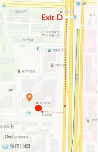 地铁10号线劲松站D口往南,劲松南路右转就到了
