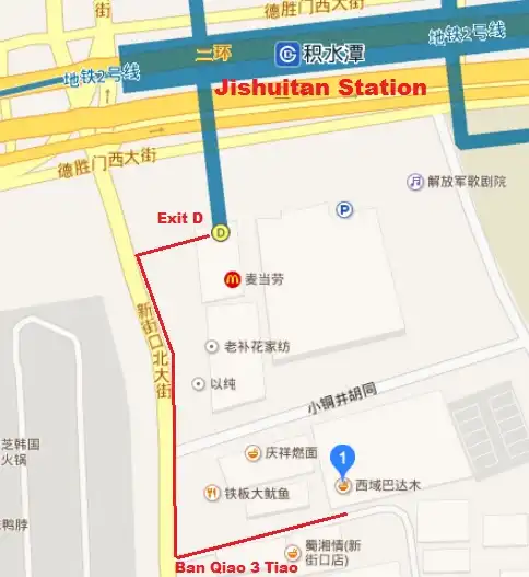 Subway Line 2 Jishuitan Station Exit D. Turn left out of the station and walk south about 100 meters. Turn left at the sign reading “Ban Qiao 3 Tiao”. The restaurant is 50 meters down the alley on the left.