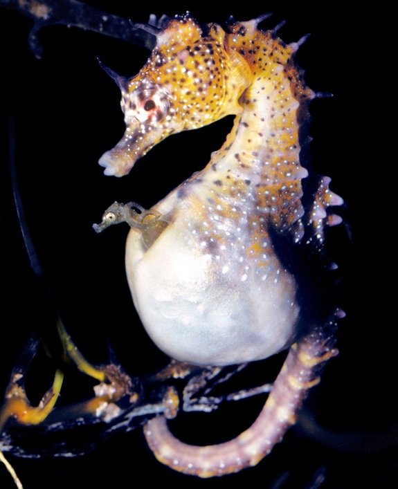 A newborn pot-bellied seahorse peeks its head out from its father’s pouch.