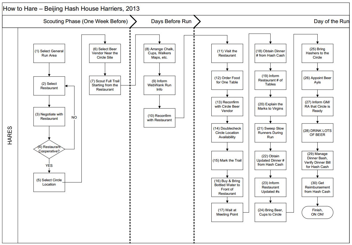 - Inform GM that hares are ready. GM announces run number and hands over to the hares.