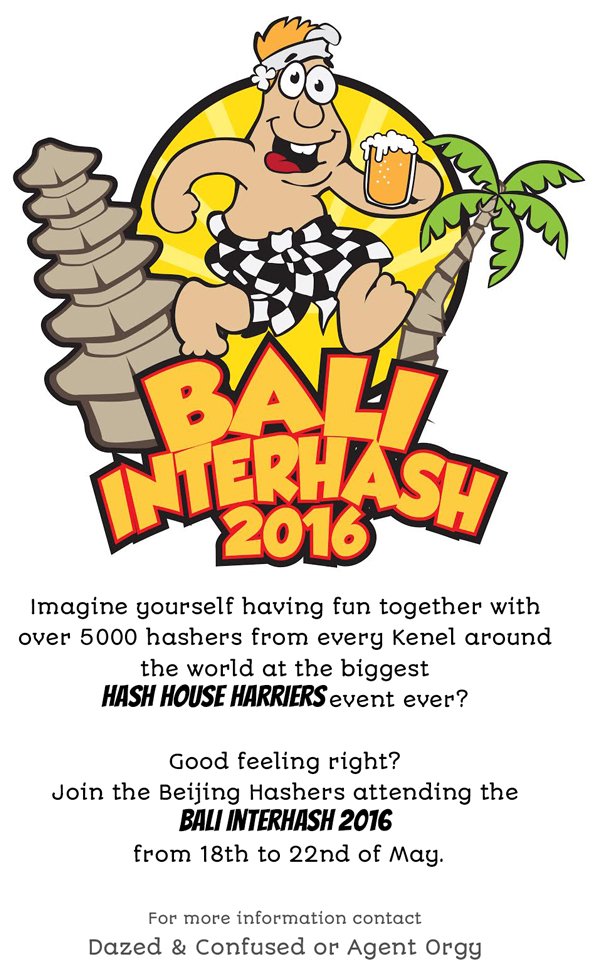Before he passed away KuntFoo asked me to please repeat at IH2016 the Old Farts Run we did during the Asia Pacific hash in Bali in 2014 as he had enjoyed it so much. So true to my word we will have ‘KuntFoo’s Old Farts Run’ in his memory. That beer stroll will be on the Sunday 22nd May at 3pm around Sanur and there will be numerous beer stops. Ask for more info onIH16events@yahoo.com