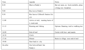 We’re a running hash. It’s ok to walk but not to lallygag. Keep moving… Heart attacks are not permitted. As we are out on mountain trails, it’s easy to get lost. Please bring a phone with you! We may or may not send a search party looking for you. If we do, chances are it will consist primarily of rabid dogs and hungry wolves. That being said, we are glad to have you join us and hope you enjoy a great day! (by the way, no you won’t be back for your important dinner date bring them along instead)